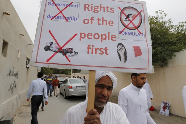 A protester holding an anti-Formula One banner reading, 'Rights of people first' shouts anti-F1 slogans as they march after Friday prayers in village of Diraz, west of Manama, Bahrain, 1 April 2016 (Reuters)