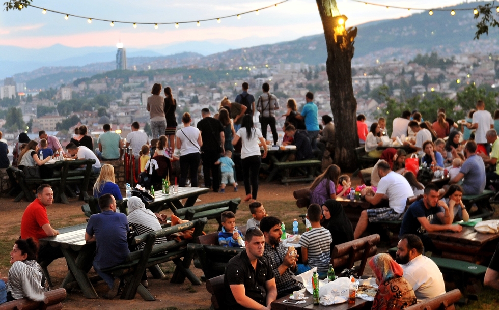 Photo: Bosnian Muslims gather for an outdoors meal at a vantage point overlooking Sarajevo (AFP)
