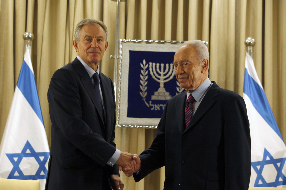 Photo: Israeli President Shimon Peres (R) shakes hand with Tony Blair (AFP)