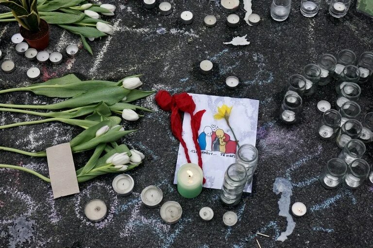 Photo: A drawing by French cartoonist Plantu depicting the Brussels and Paris attacks lies between candles and flowers at a makeshift memorial at Place de la Bourse (Beursplein) in Brussels on 23 March 2016 (AFP).