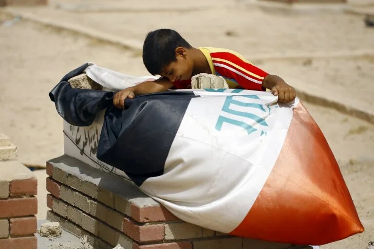 Photo: An Iraqi youth mourns over the coffin of a relative wrapped in the national flag on 14 July 2014 at one of the world's biggest cemeteries in the holy Shia city of Najaf (AFP)