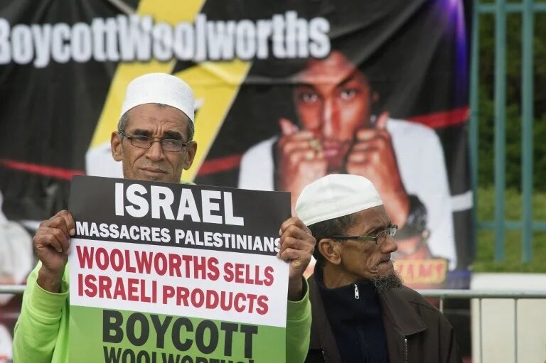 Photo: A Muslim man holds a placard reading 'Israel massacres Palestinians. Woolworths sells Israeli products' in Cape Town in 2015 (AFP).