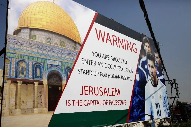Photo: A picture taken on 5 June 2018 shows a poster erected on a main street in the West Bank town of Hebron, denouncing the since-cancelled friendly football match between Argentina and Israel (AFP)