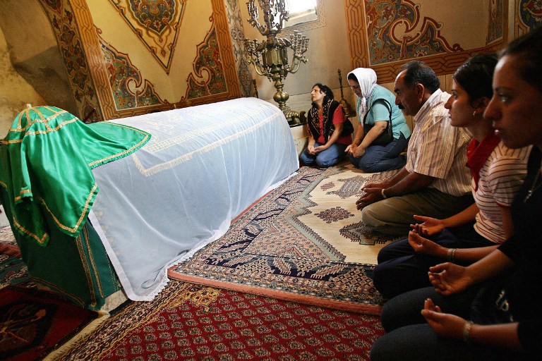 Photo: An Alevi family prays near a holy tomb in Hacibektash, Turkey on 15 August 2005 (AFP).
