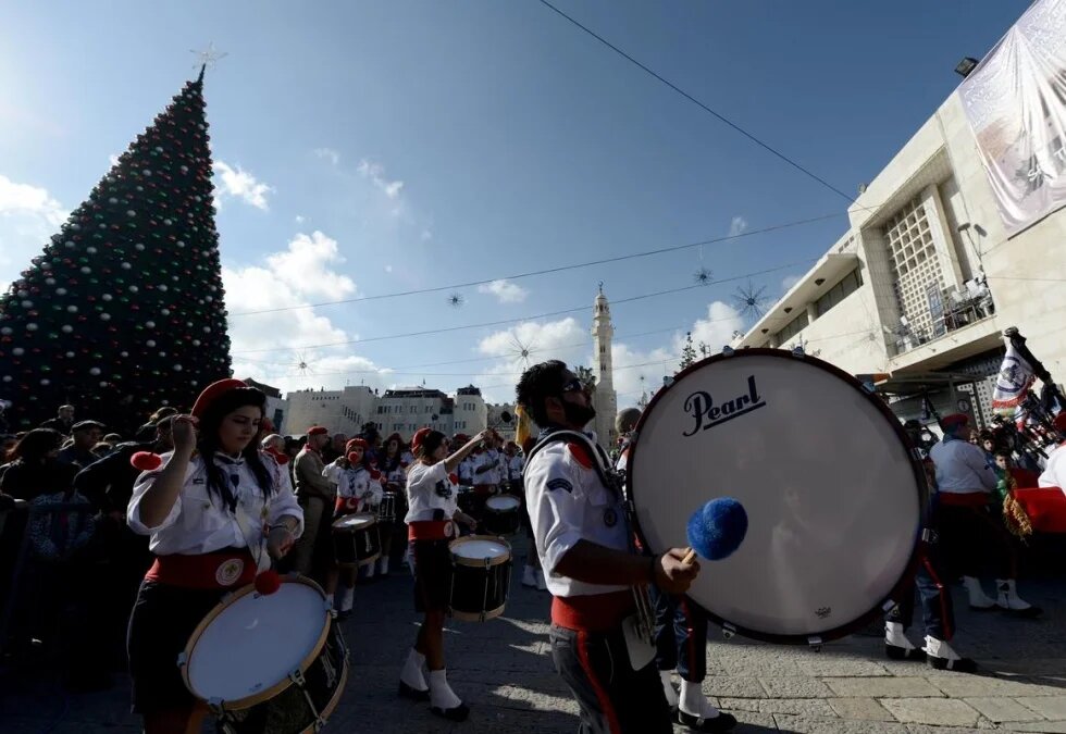 Photo: Marching band perform as Christian pilgrims visit the Church of the Nativity, believed to be the birthplace of Jesus Christ, on 24 December, 2014 in the biblical town of Bethlehem, West Bank (AA)