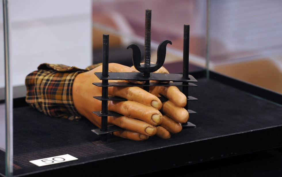 Photo: A wax replica of the finger torture screw is pictured at the German Hygiene museum in Dresden in October 2014 (AFP PHOTO / DPA/ MATTHIAS HIEKEL /GERMANY OUT)
