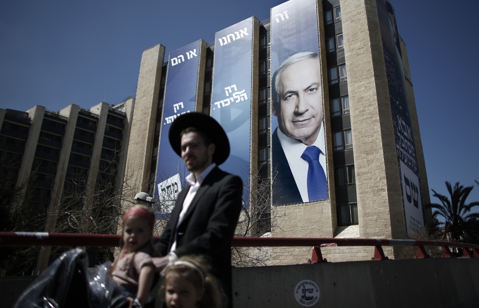 Photo: An Ultra-Orthodox Jewish man walks past a giant poster of Israeli Prime Minister Benjamin Netanyahu, Likud party's candidate running for general elections, in Jerusalem, on March 5, 2015 (AFP)