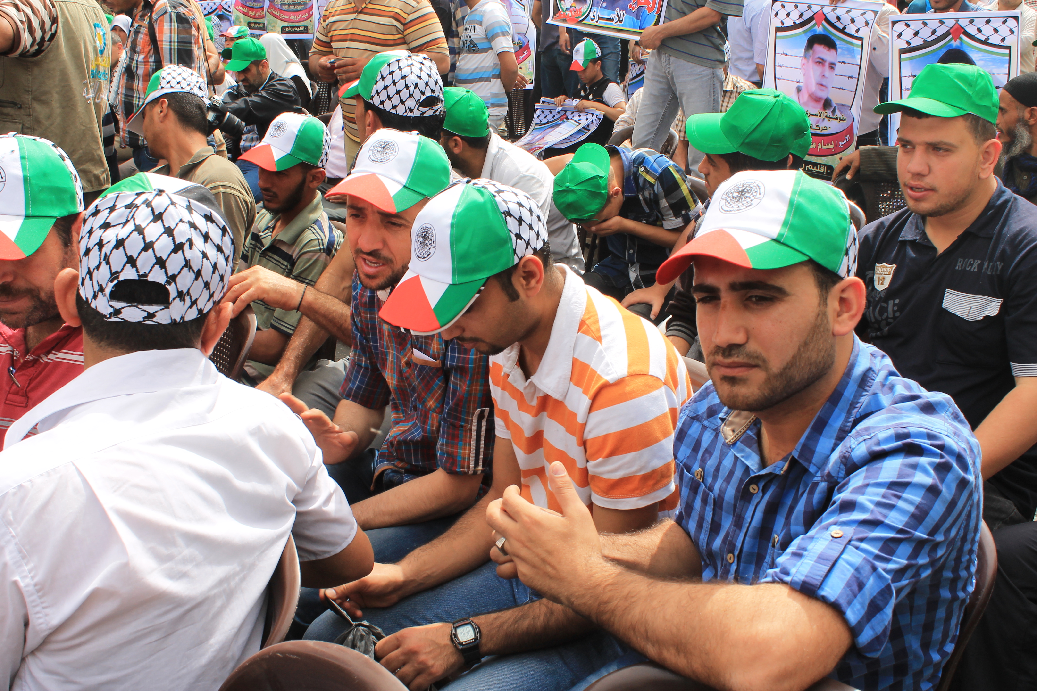 Photo credit: Men wear Hamas and Fatah caps during a joint rally held by the two movements to support Palestinian prisoners on a mass hunger strike (MEE/Joe Catron)