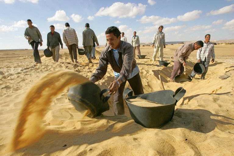 Photo: Egyptian antiquities workers excavate in the desert of the Valley of the Golden Mummies in the Bahariya oasis, 375 kms west of Cairo in December 2004 (AFP)