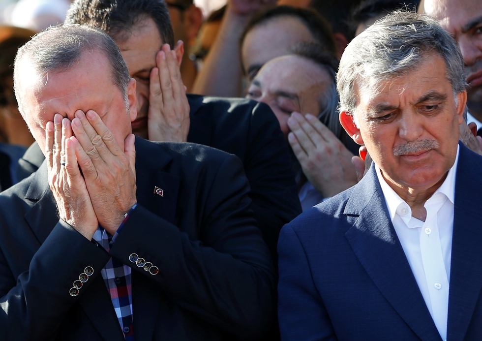 Photo: Turkish President Recep Tayyip Erdogan (L) and his predecessor Abdullah Gul pray during a funeral service for a victim of the thwarted coup in Istanbul, Turkey, July 17, 2016 (REUTERS)