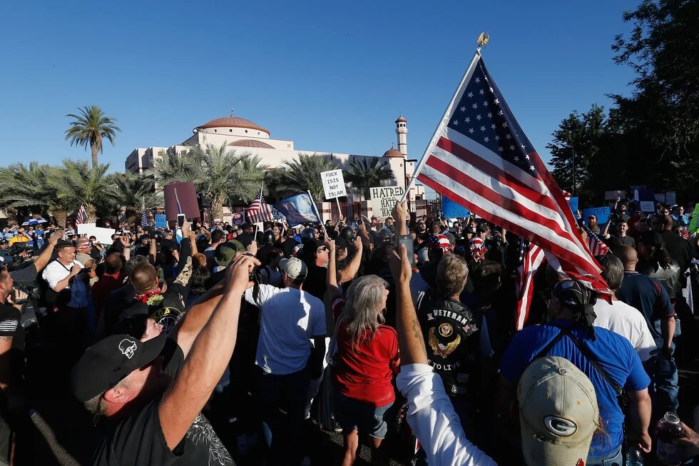 Photo: Protesters and counter-protesters rally outside the Islamic Community Center on 29 May, 2015 in Phoenix, Arizona.