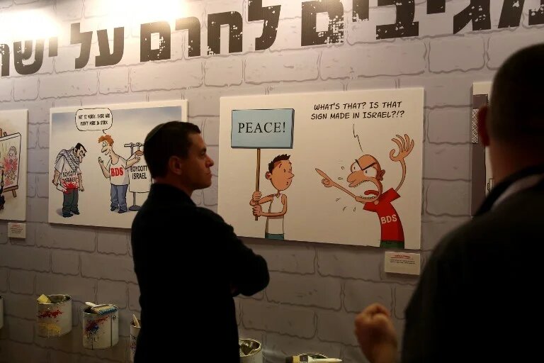 Photo: People look at caricatures of Israeli artists against the Palestinian-led Boycott, Divestment and Sanctions (BDS) movement displayed during the Ynet and Yedioth Ahronoth's anti-BDS conference on March 28, 2016, in Jerusalem (AFP).