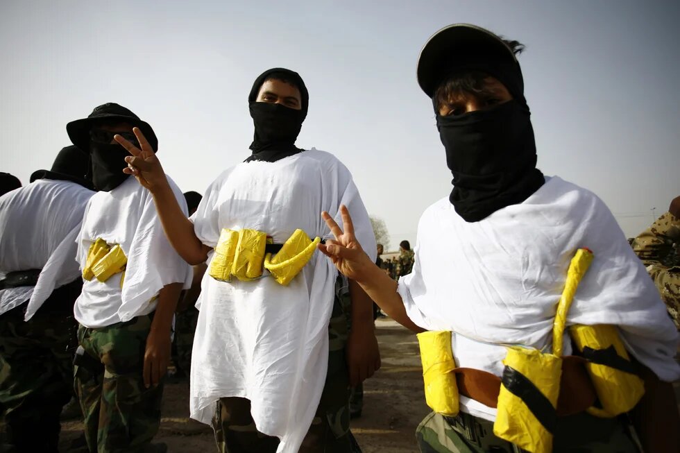 Photo: Supporters of the Saraya al-Salam (Peace Brigades), a group formed by Iraqi Shia Muslim cleric Moqtada al-Sadr, dressed up as suicide bombers, flash the sign for victory in Iraq's holy city of Najaf as the pro-government paramilitary group prepare to reinforce government forces in the fight against the Islamic State group for control of Fallujah, east of the capital, on 17 May, 2016 (AFP).