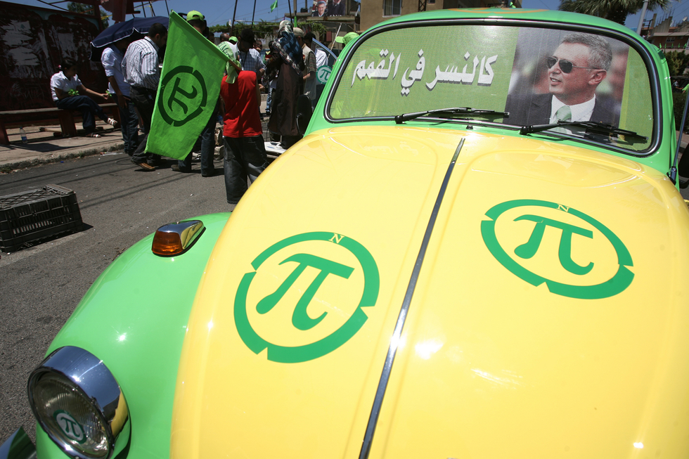 Photo: A car decorated with the logo and colours of the Christian movement of Al-Marada led by candidate Suleiman Frangieh (picture) drives past supporters in the northern city of Zgharta on 7 June, 2009 (AFP).
