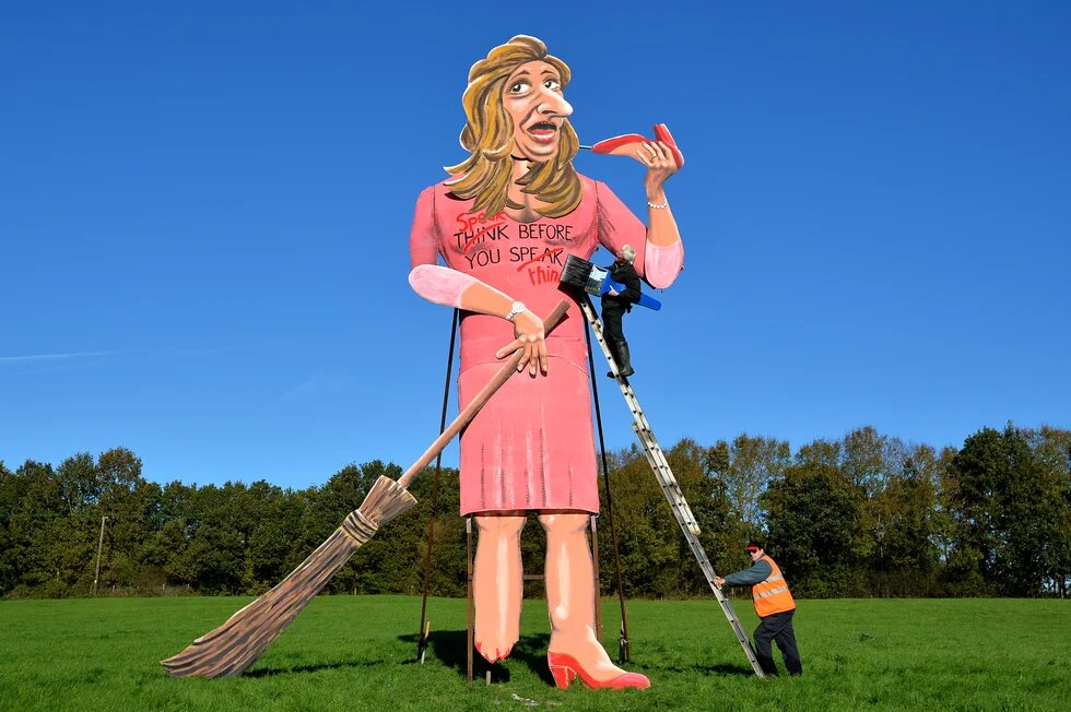 Photo: British artist Frank Shepherd puts the finishing touches to a giant effigy of Katie Hopkins in Edenbridge, Kent, southeast England, on 30 October, 2013 (AFP).