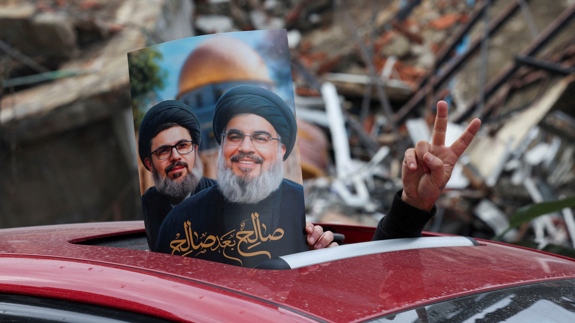The occupants of the vehicles raised their hands in a victory sign while waving Hezbollah flags and portraits of the party's historical leader, Hassan Nasrallah, who was killed by Israel on 27 September.