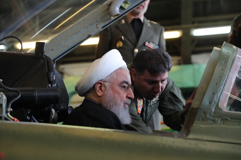 Photo: President Hassan Rouhani (L) sitting in the cockpit of the "Kowsar" domestic fighter jet, at the National Defence Industry exhibition in the capital Tehran on 21 August, 2018 (AFP)