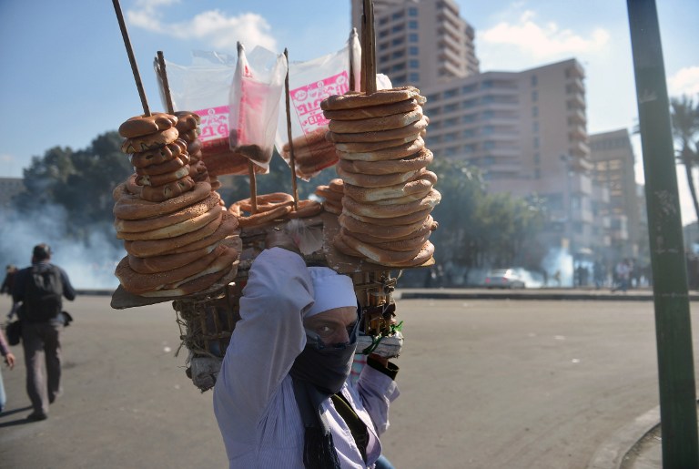 Photo: An Egyptian street vender selling bread walks past as a tear gas canister fired by riot police during clashes with protesters near Cairo's Tahrir Square in January 2013 (AFP).