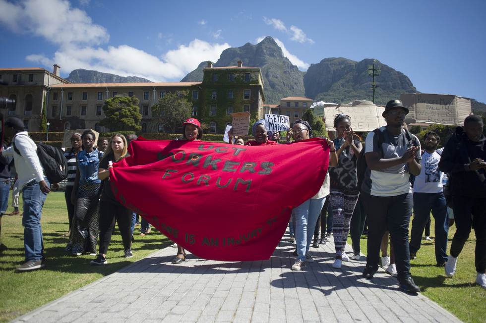 Image: Students and staff of the University of Cape Town (UCT) march on campus during a protest against the statue of British coloniser Cecil John Rhodes at the university in Cape Town on 20 March 2015. (AFP)