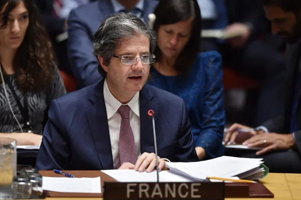 Francois Delattre, France’s ambassador at the UN during a Security Council session on 14 April 2018 (AFP)