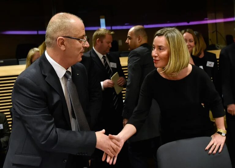 Photo: Federica Mogherini, the high representative of the union for foreign affairs and security policy, welcomes Palestinian Prime Minister Rami Hamdallah during a meeting at EU headquarters in Brussels on 31 January 2018 (AFP).