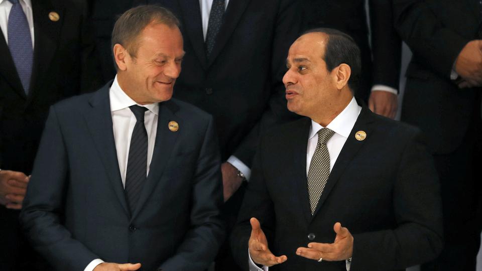 European Council President Donald Tusk talks with Egyptian President Abdel Fattah al-Sisi at the February summit in Sharm el-Sheikh (AFP)