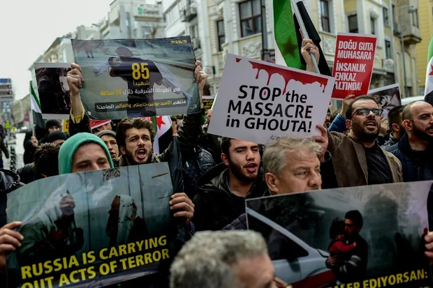 Protesters chant slogans as they hold placards in front of the Iranian consulate in Istanbul on 3 March 2018, during a protest against air strikes and shelling by Syrian government forces in Ghouta (AFP)