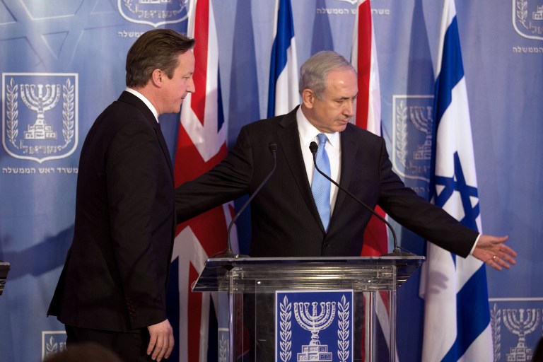 Photo: Israeli Prime Minister Benjamin Netanyahu (R) and his British counterpart David Cameron attend a joint press conference in Jerusalem on 12 March, 2014 (AFP).