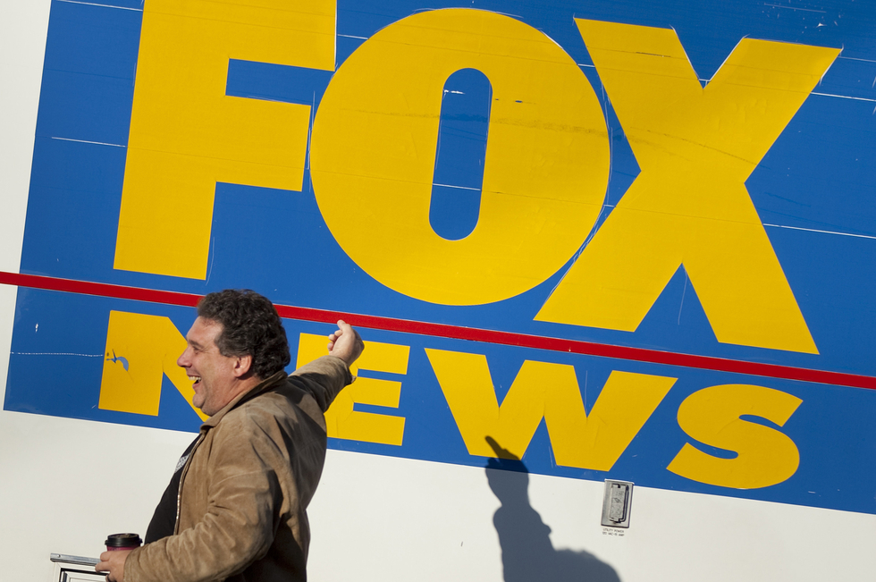 Photo: A man gestures toward a Fox News satellite truck before on 30 October, 2010 in Washington, DC (AFP).