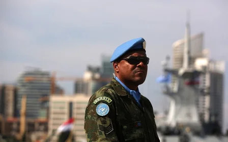 Photo: A peacekeeper of the United Nations Interim Force in Lebanon (UNIFIL) speaks on his talkie-walkie in front of a billboard bearing a portrait of Hezbollah chief Hassan Nasrallah during a patrol in the southern Lebanese town of Adaysseh, near the border with Israel, on 19 January 2015, one day after an Israeli air strike killed six Hezbollah members in the nearby Syrian-controlled side of the Golan Heights (AFP)