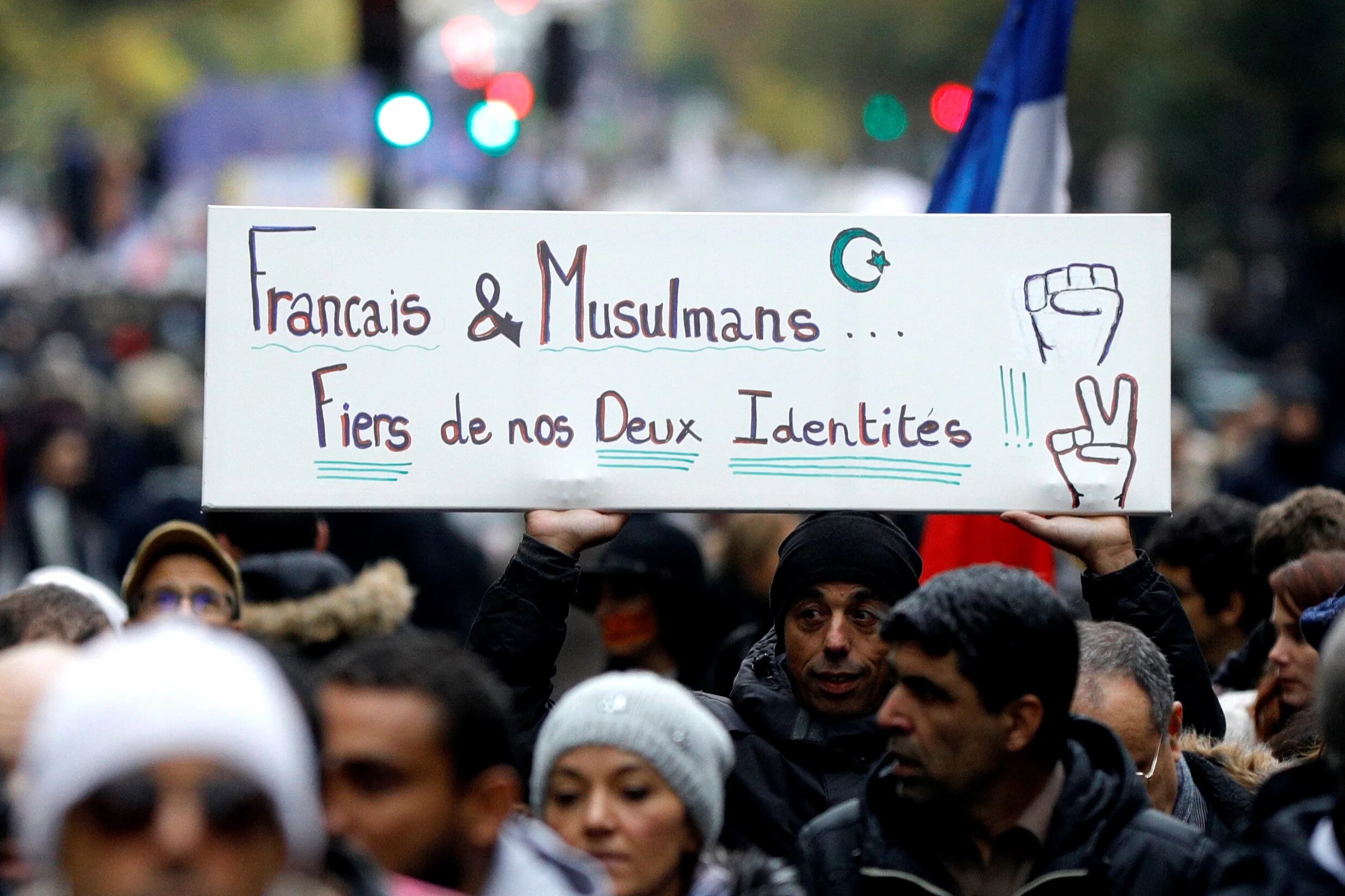 Protesters hold a placard reading "French and Muslims, proud of our identities" as they march in Paris to protest against Islamophobia, on 10 November 2019 (AFP)