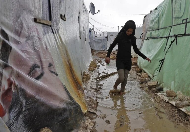 Photo: A Syrian refugee girl walks in a flooded alley past tents at an unofficial refugee camp in the village of Deir Zannoun in Lebanon's Bekaa valley on 31 January 2017 (AFP)