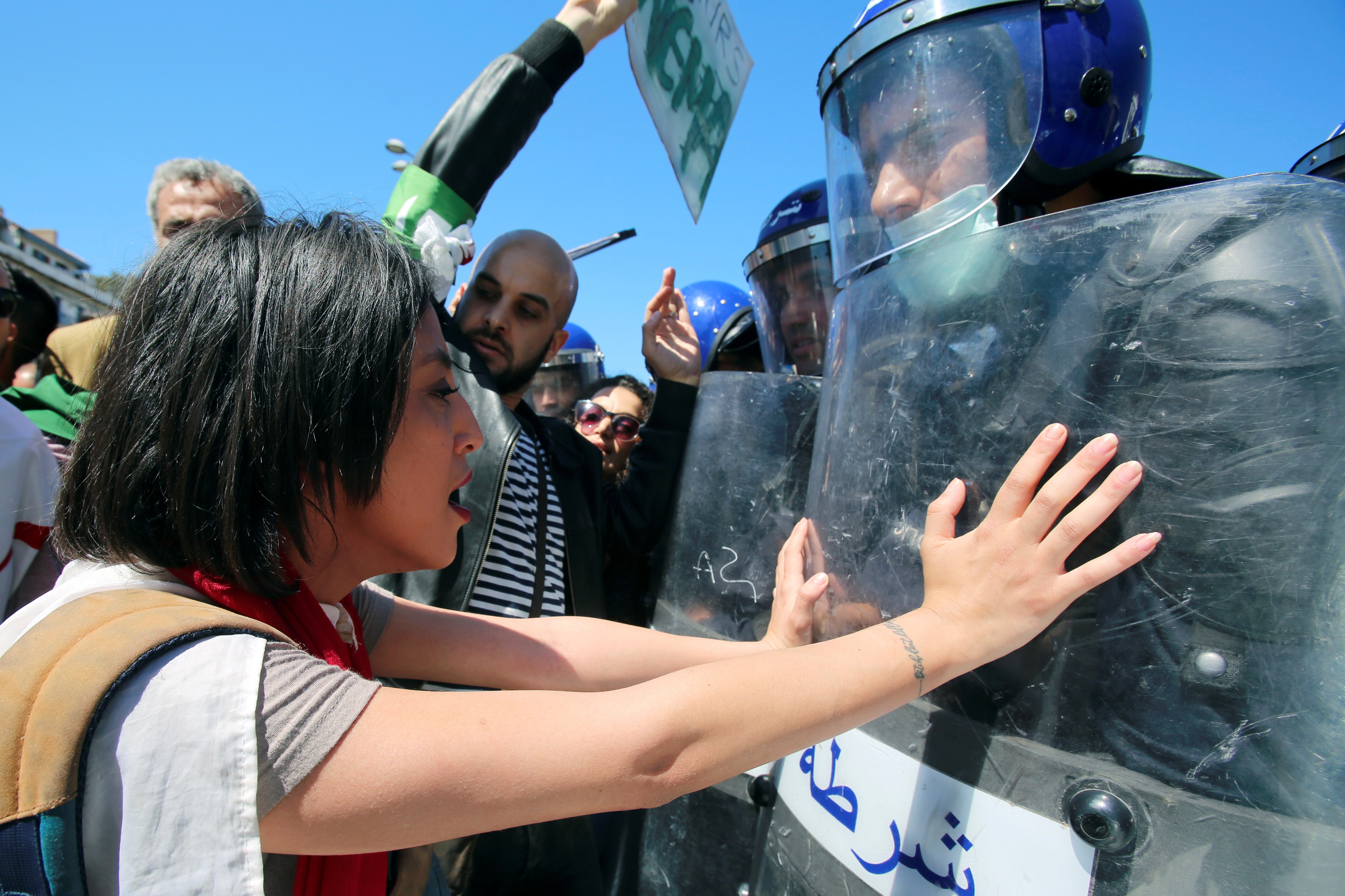Police officers prevent demonstrators from marching during a May Day protest on Labour Day in Algiers, Algeria, 1 May (Reuters)