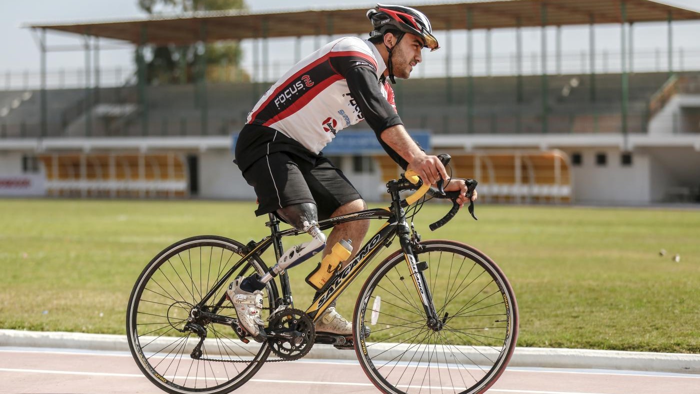 Palestinian cyclist, Alaa al-Daly, who lost his leg after being shot by Israeli snipers, continues his daily training at Yarmouk Stadium in Gaza City, on 12 February 2019 (Sameh Rahmi/supplied by author)