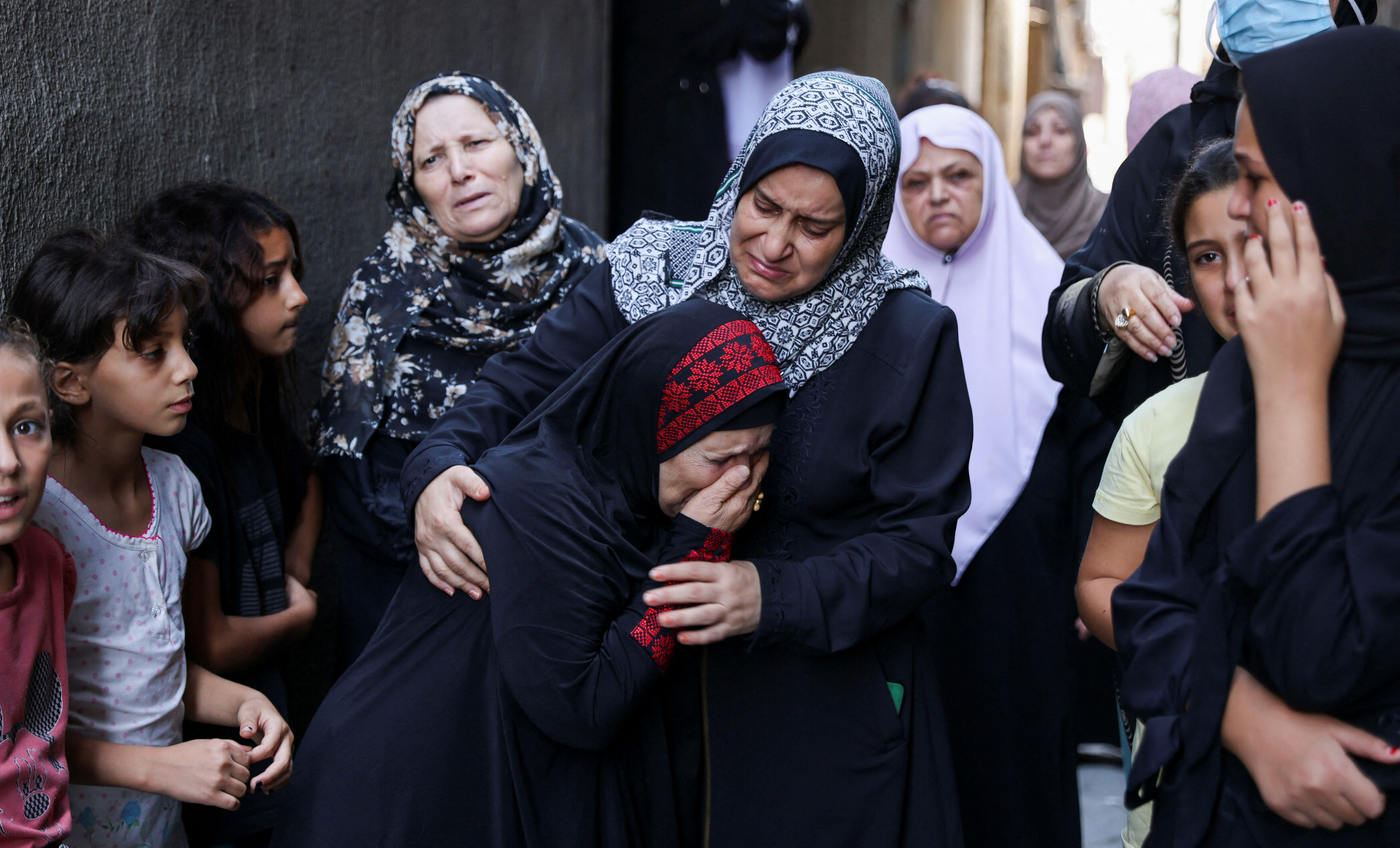Relatives mourn during the funeral of four teenage Palestinian cousins killed during the latest Israeli assault on Gaza, in Jabalia, on 8 August 2022 (Reuters)