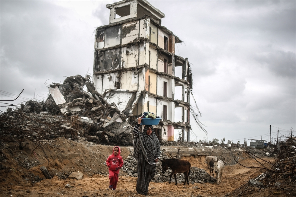 Photo: A Palestinian woman with her daughter after heavy rainfall in Beit Lahia, Gaza on 24 January, 2016 (AA)