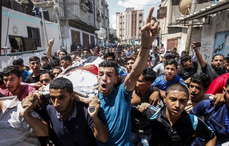 Photo: Mourners in the Rafah refugee camp carry the body of a boy killed by Israeli forces during the Gaza protests on 28 July 2018 (AFP)