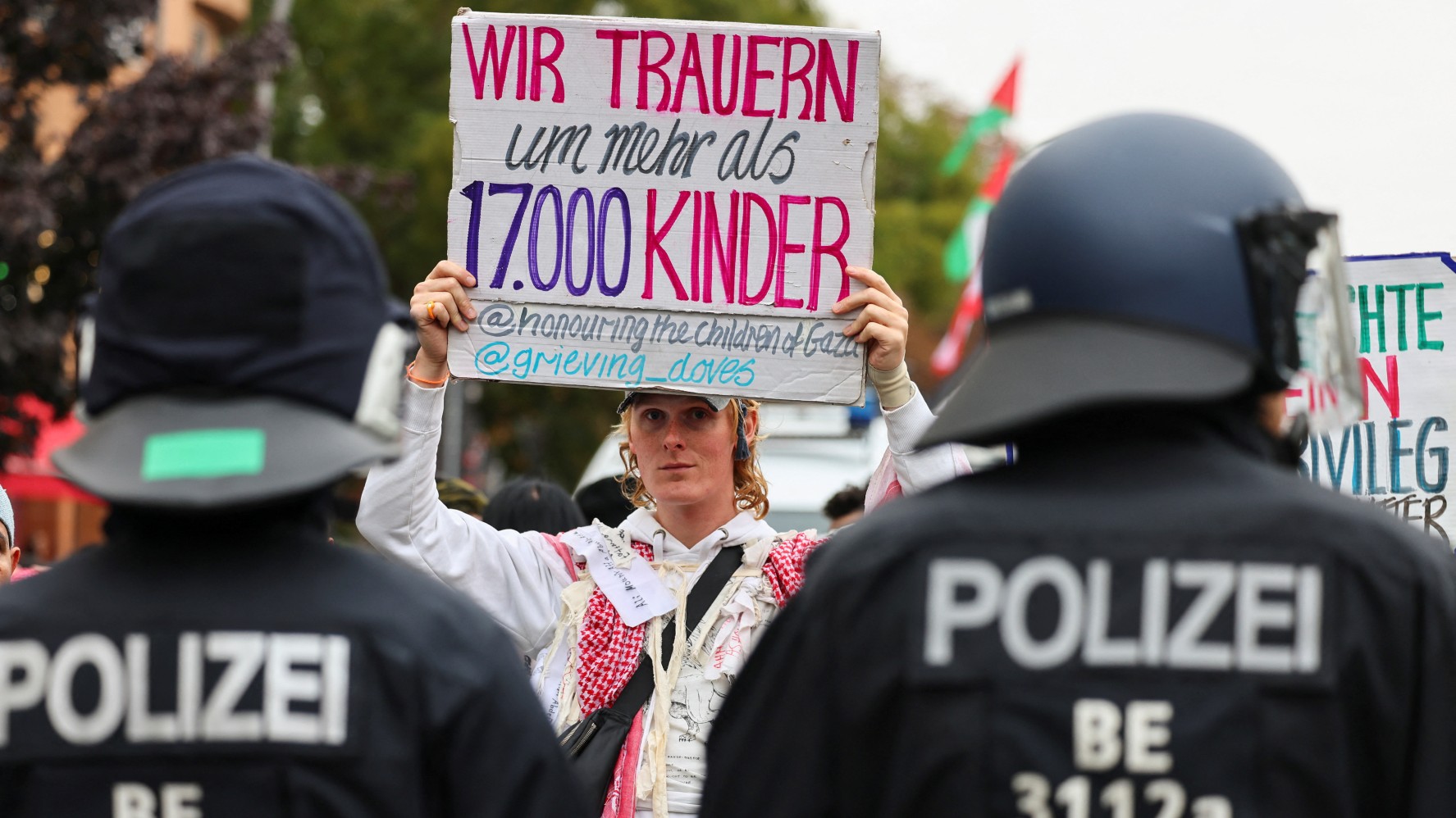 A protester holds a placard during a demonstration in support of Palestinians in Gaza in Berlin on 6 October, 2024 (Reuters)