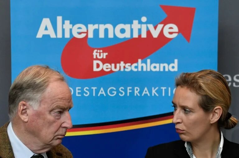 Photo: Alexander Gauland (L) and Alice Weidel, leadership members of Germany's hard-right Alternative for Germany (AfD) party, give a statement on the sidelines of a meeting of the AfD's parliamentary group at the Marie-Elisabeth-Lueders-Haus parliamentary building in Berlin on September 27, 2017, three days after general elections. [AFP]