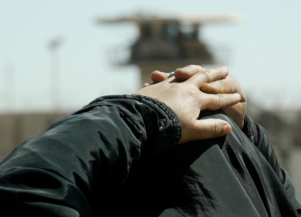 Photo: An Iraqi woman rests her hands on her head as she waits outside the Abu Ghraib jail, 30 kms west of Baghdad, 23 May 2004, in hope of getting information about a relative held by US forces (AFP)