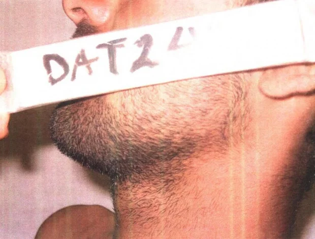 An identifying marker is held against the face of a detainee in an undated photo from Iraq's Abu Ghraib prison. (REUTERS/DoD)