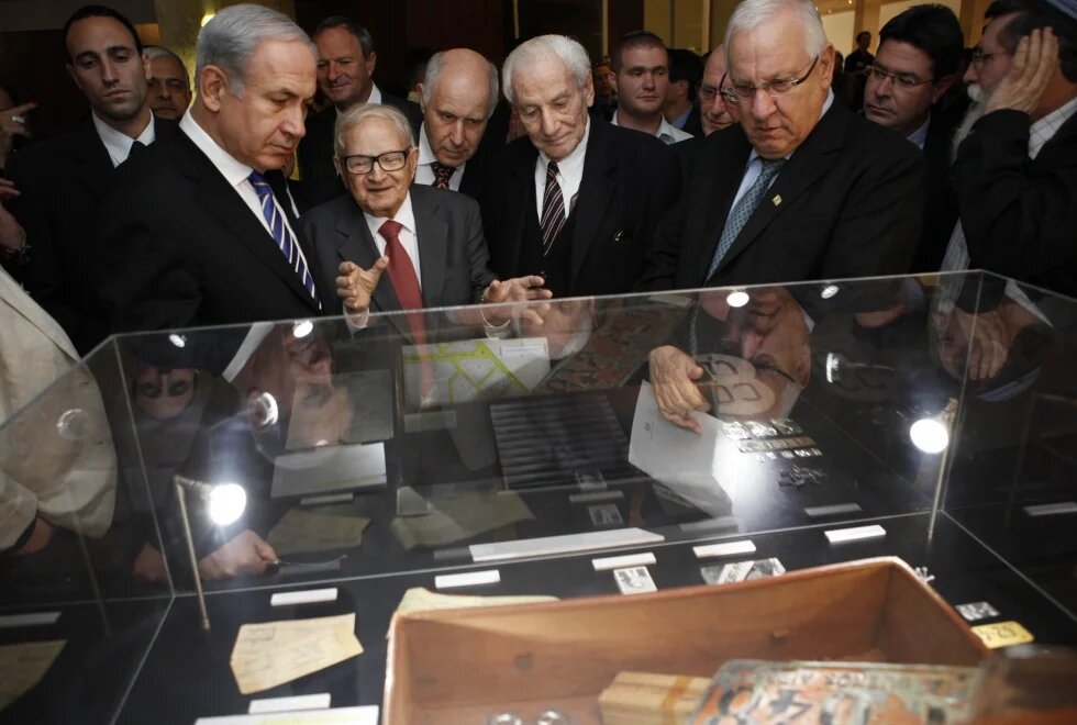 Photo: Benjamin Netanyahu and former Israeli Minister Rafi Eitan (2nd L), who was a member of the Mossad team that captured Adolf Eichmann in Argentina in 1960, look at objects displayed at an exhibition at the Knesset in Jerusalem on 12 December, 2011(AFP)