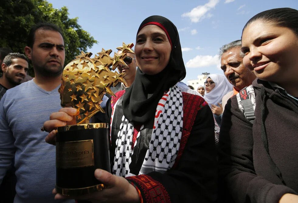 Photo: Hanan Al-Hroub (C), a Palestinian teacher who won the Global Teacher award, poses with her trophy during a public reception upon her arrival in the West Bank city of Jericho from Jordan on 16 March, 2016 (AFP).