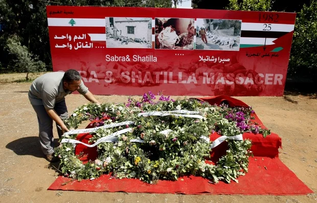 A Palestinian lays a wreath outside a cemetery where scores of Palestinians who were killed during the 1982 Sabra and Shatila masscare are buried in Beirut on 11 September 2007 (AFP)