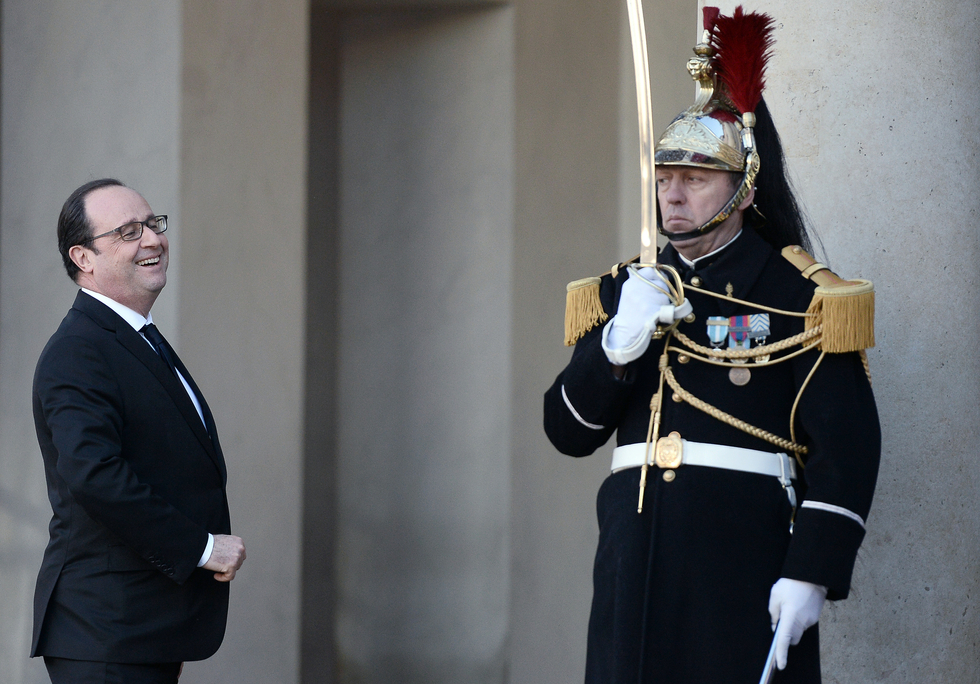 Photo: French President Francois Hollande smiles to journalists on February 8, 2016 at the Elysee Presidential Palace in Paris.