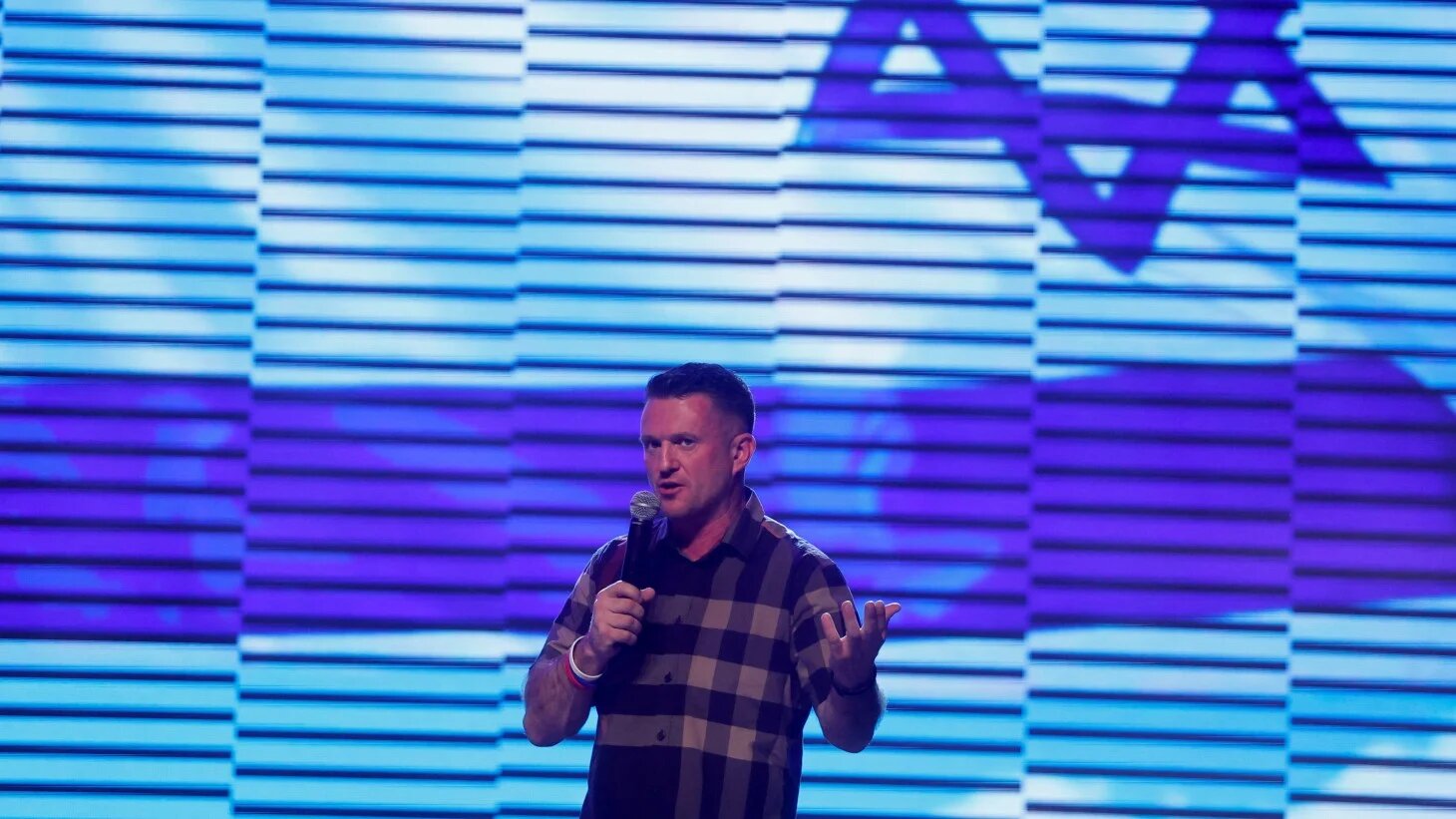 Anti-immigration activist Stephen Yaxley-Lennon, known as Tommy Robinson, speaks during a public address in Tel Aviv on 18 October 2025 (Reuters)