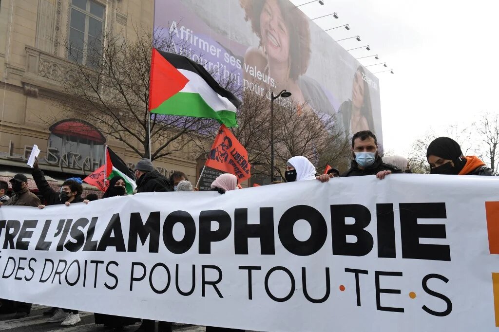 Protesters demonstrate against Islamophobia in Paris on 21 March 2021 (AFP)