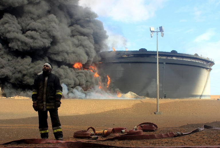 Photo: A Libyan fireman in front of an oil storage tank after Islamic State militants attacked the facility in the Ras Lanuf region in late January 2016 (AFP)