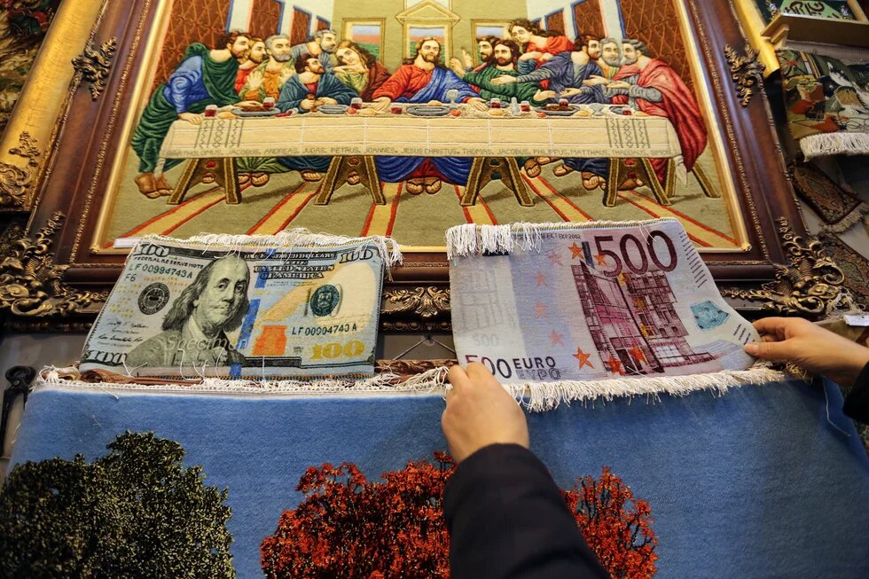 Photo: An Iranian vendor displays carpets at his shop in Tehran's ancient Grand Bazaar on 16 January, 2016 (AFP).
