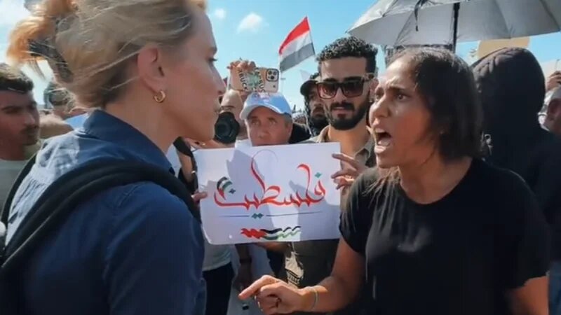 In a viral video, Egyptian activist Zein Rahma, right, confronts CNN's Clarissa Ward on the network's reporting of the Israel-Palestine war, in Rafah, on 20 October (Screengrab)